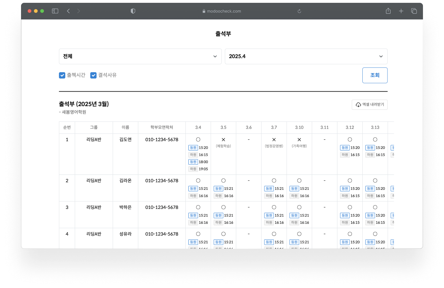 모두출첵은 안정적인 출결 알림 발송뿐만 아니라, 강력한 사후 관리 기능까지 제공합니다.