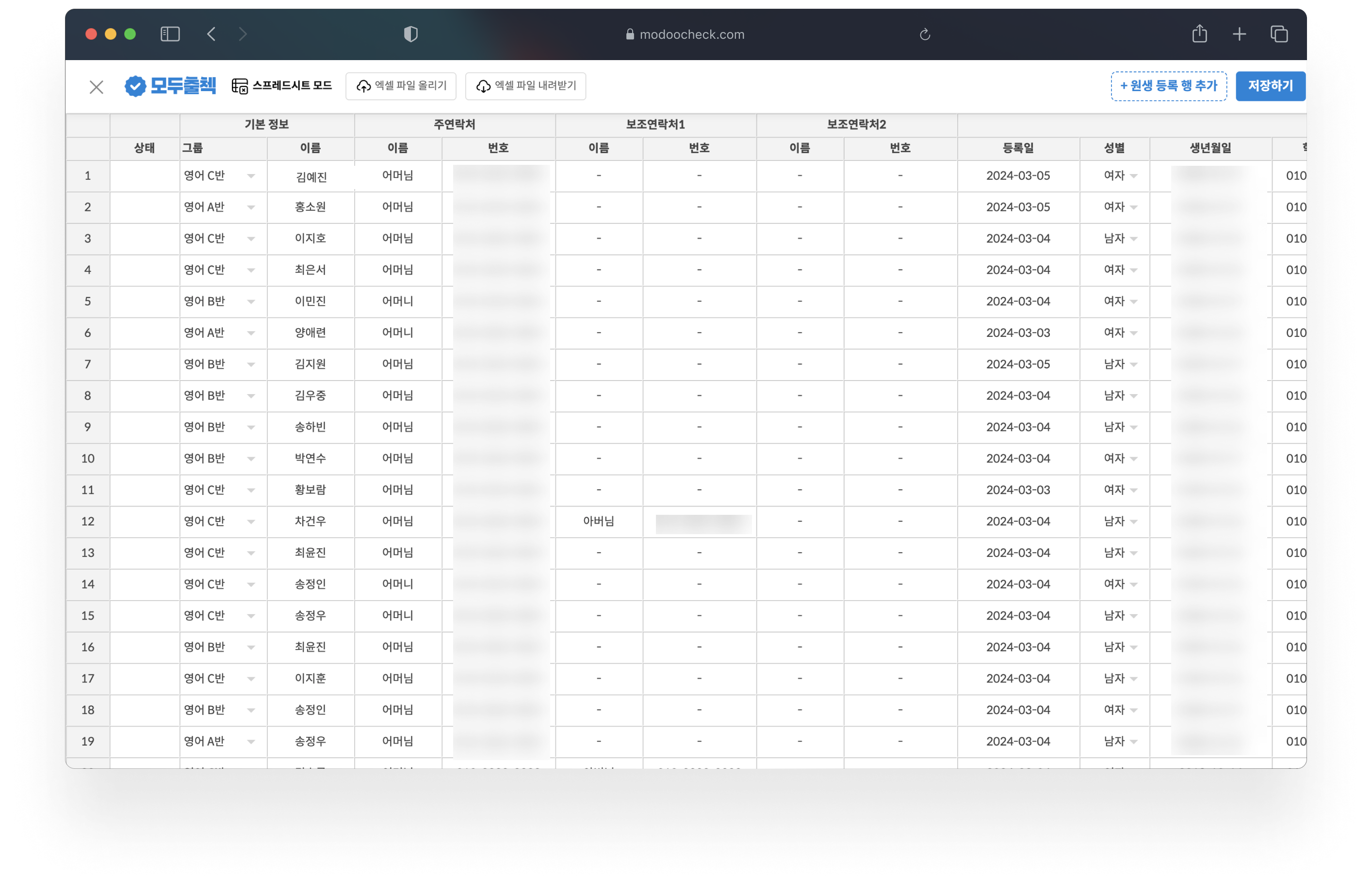 수백 명의 학생 명단과 정보를 엑셀처럼 웹상에서 바로 수정하고 관리할 수 있습니다.