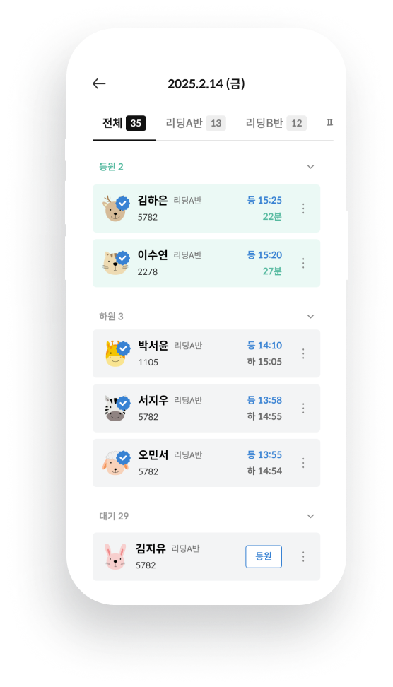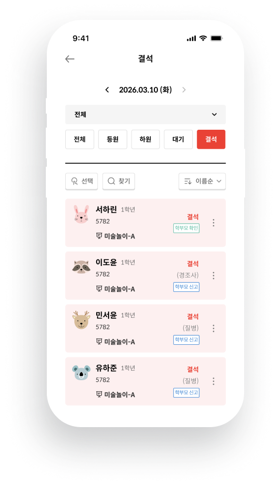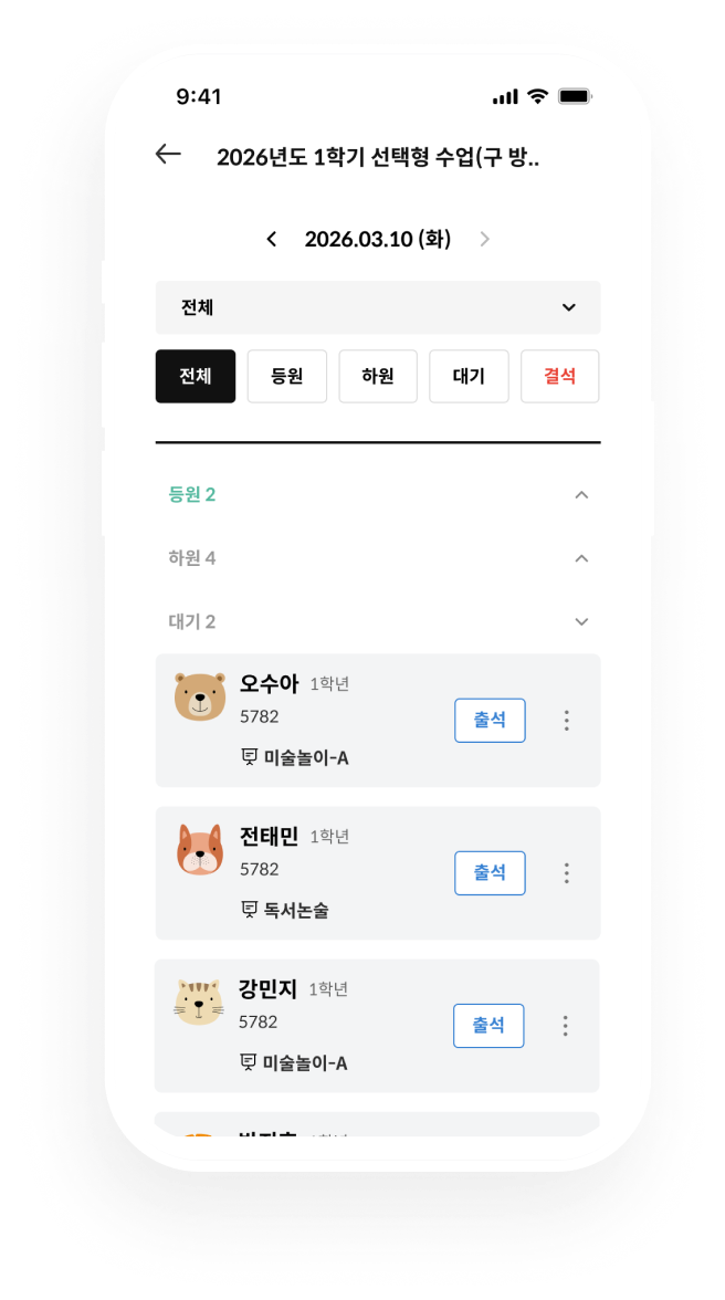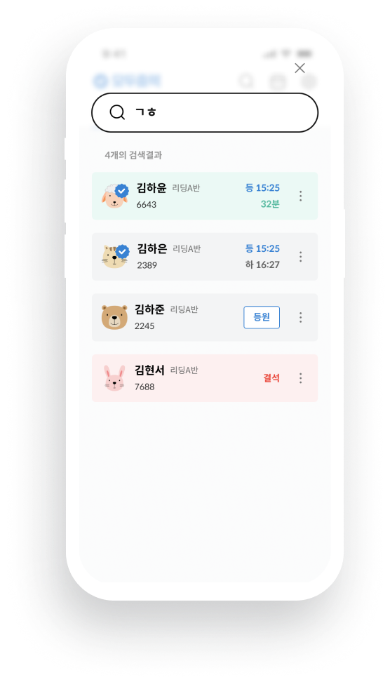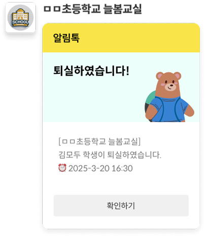 출석 처리와 동시에, 학부모에게 안심 출결 알림이 발송됩니다.