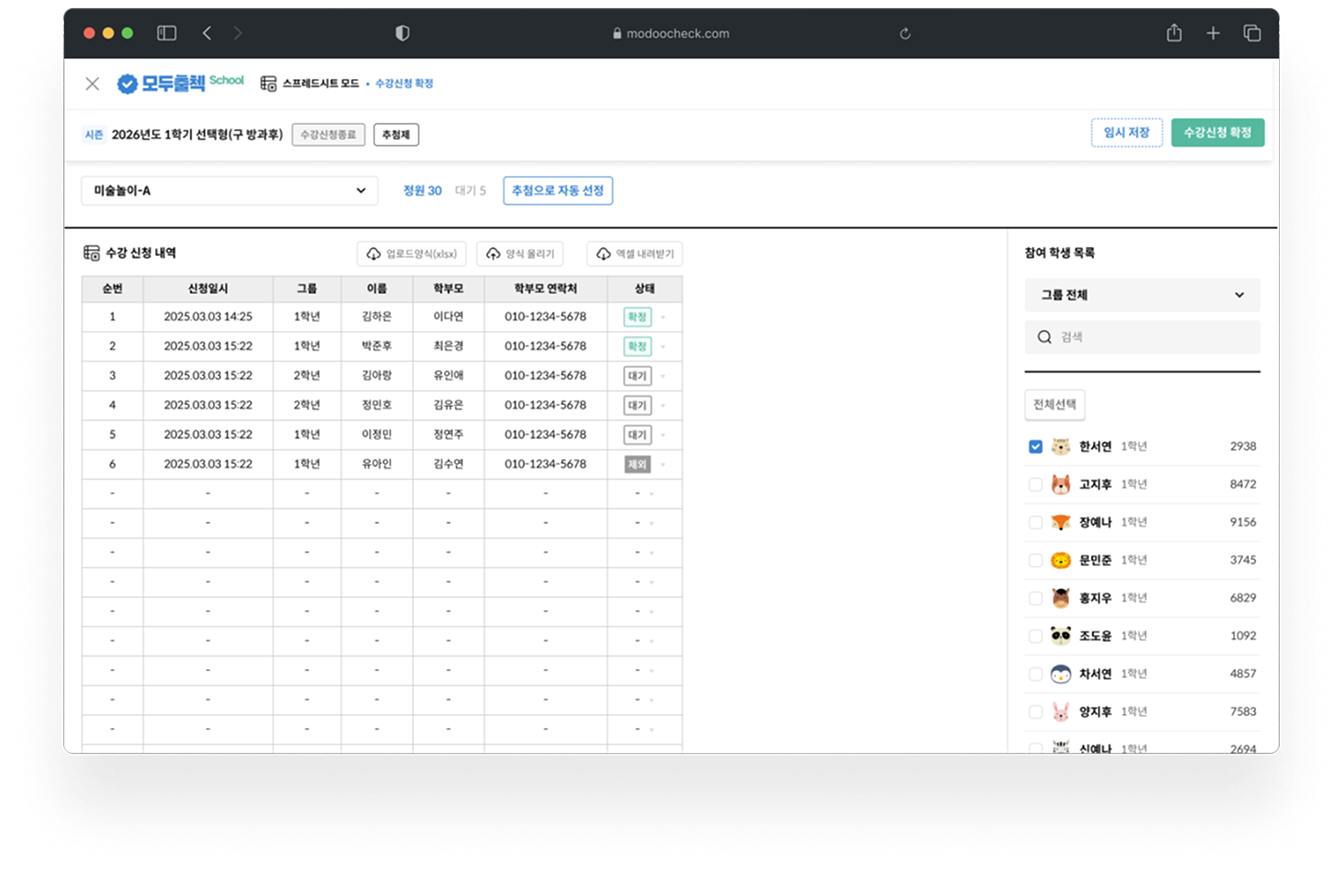 수업별 수강확정처리도 스프레드시트 모드에서 간편하고 빠르게 처리하세요.