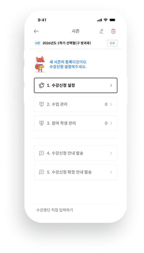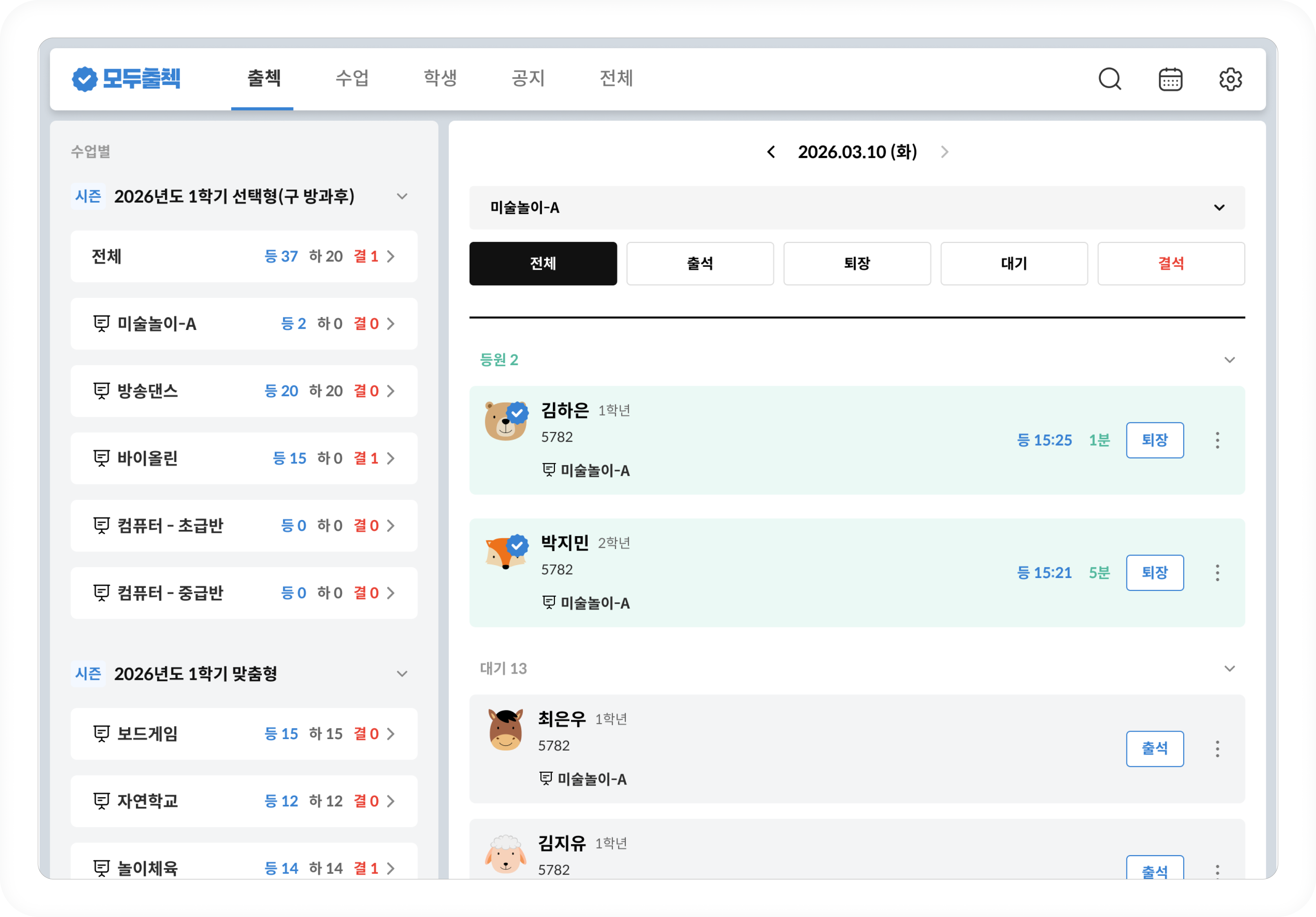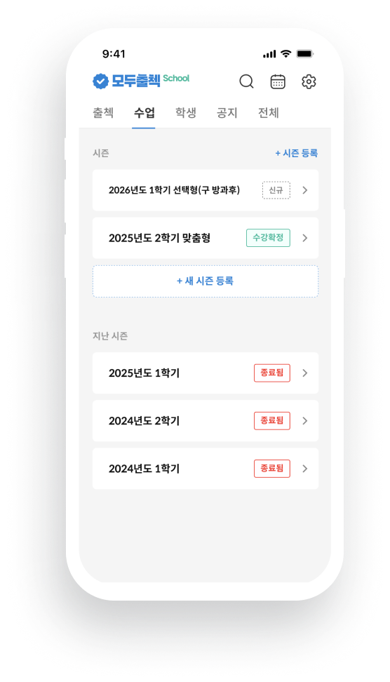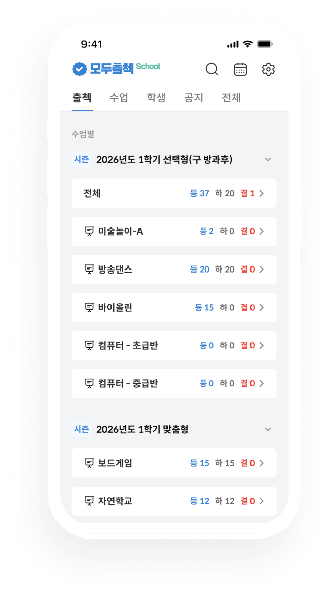 시즌별로 등록된 수업을 확인하고, 수업별로 출석 체크하세요.