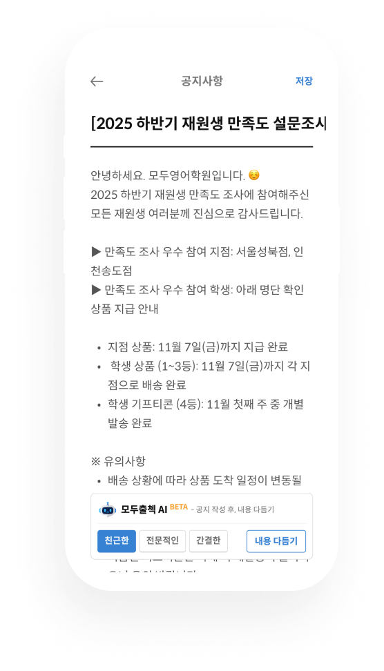 모두출첵 AI 글쓰기 를 이용하면 공지 작성도 더 쉬워지죠!