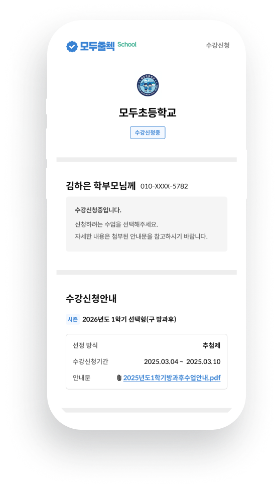 학부모는 별도 앱 설치, 회원가입 없이, 카카오 알림톡으로 안내된 링크로 접속해 원하는 강좌를 수강 신청합니다. -