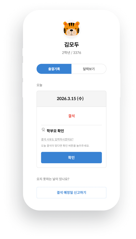 결석 알림 문자를 받은 학부모가 모바일에서 바로 '확인' 처리를 할 수 있어, 수신 여부를 일일이 확인할 필요가 없습니다. -