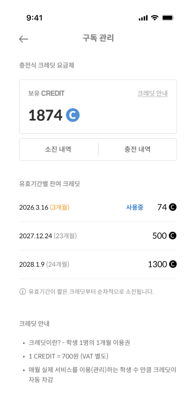 - 매월 실제 서비스를 이용(관리)하는 학생 수만큼 크레딧 자동 차감